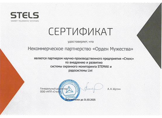 "Орден Мужества" стал официальным партнёром российского производителя интеллектуальных систем телематики и безопасности НПП "Стелс", что подтверждено соответствующим сертификатом.